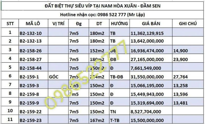 | Vị trí | Mặt tiền đường 7,5 m – 10,5 m, đối diện trường học, gần trục đường lớn Nguyễn Phước Lan, trung tâm Nam Hòa Xuân | Khu vực Nam Hòa Xuân là khu đô thị phát triển đồng bộ với nhiều dự án hạ tầng, dân cư đông đúc | Vị trí chiến lược, thuận tiện giao thông và sinh hoạt, tăng giá trị đầu tư. |