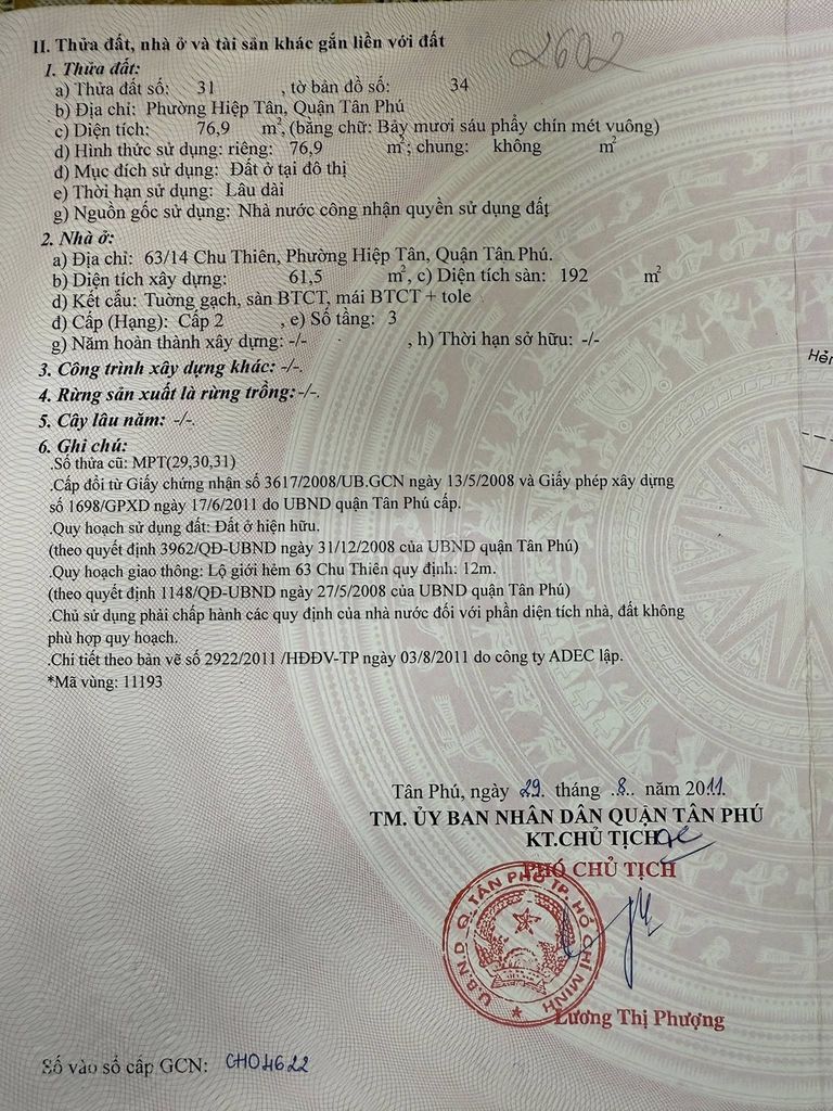 14 Lê Thận, Hiệp Tân, Tân Phú 76 9,2 121,05 Nhà mặt phố 3 tầng Hiện trạng tốt, đã có sổ