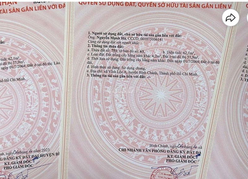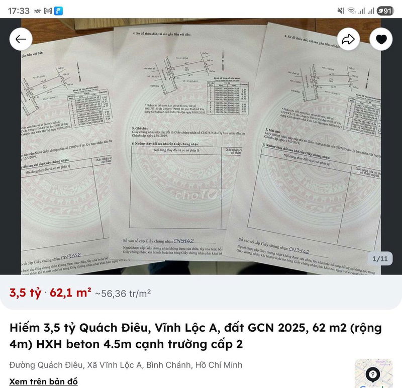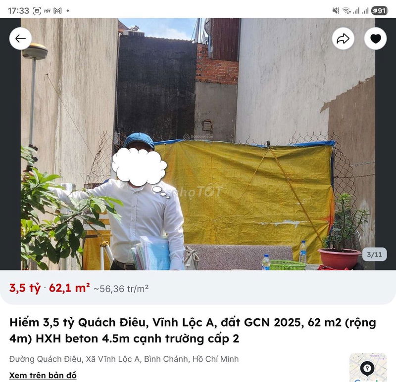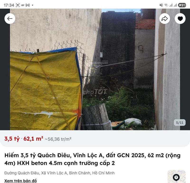 Giá chào bán 3,5 tỷ tương đương 56,45 triệu/m² là mức giá khá cao so với mặt bằng chung đất thổ cư tại Bình Chánh hiện nay, đặc biệt là khu vực xã Vĩnh Lộc A.