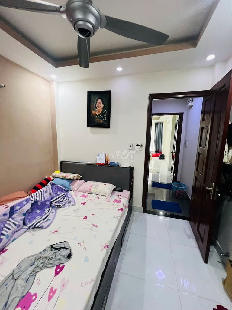 Diện tích đất 50m² (5x14m), nhà xây 5 tầng với 4 phòng ngủ, 6 WC đáp ứng nhu cầu gia đình hoặc có thể cho thuê căn hộ dịch vụ. Nhà nở hậu dạng chữ L giúp tăng diện tích sử dụng và tạo không gian thoáng hơn.
