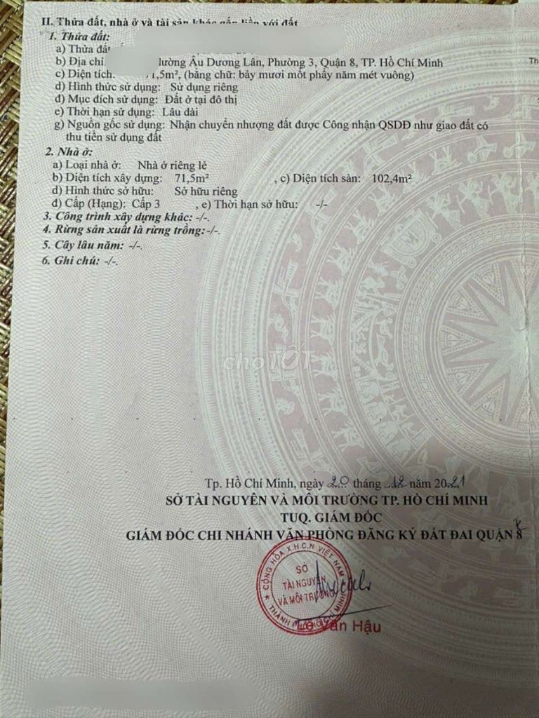 | Âu Dương Lân, Quận 8 | 71,5 | Nhà cấp 4, 2PN, 2WC, hẻm xe hơi | 3,85 | 53,85 | Sổ hồng riêng, hoàn thiện cơ bản | 2024 |