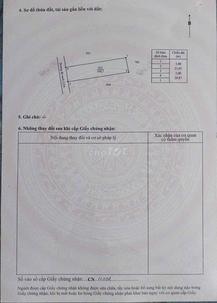 | Diện tích và hình dạng đất | 5 x 21 m (105 m²), đất thổ cư | Diện tích vừa phải, chiều ngang 5 m khá nhỏ, có thể hạn chế xây dựng một số loại nhà lớn, phù hợp cho nhà đầu tư mua lẻ hoặc xây nhà phố quy mô nhỏ. | ||||||||||||