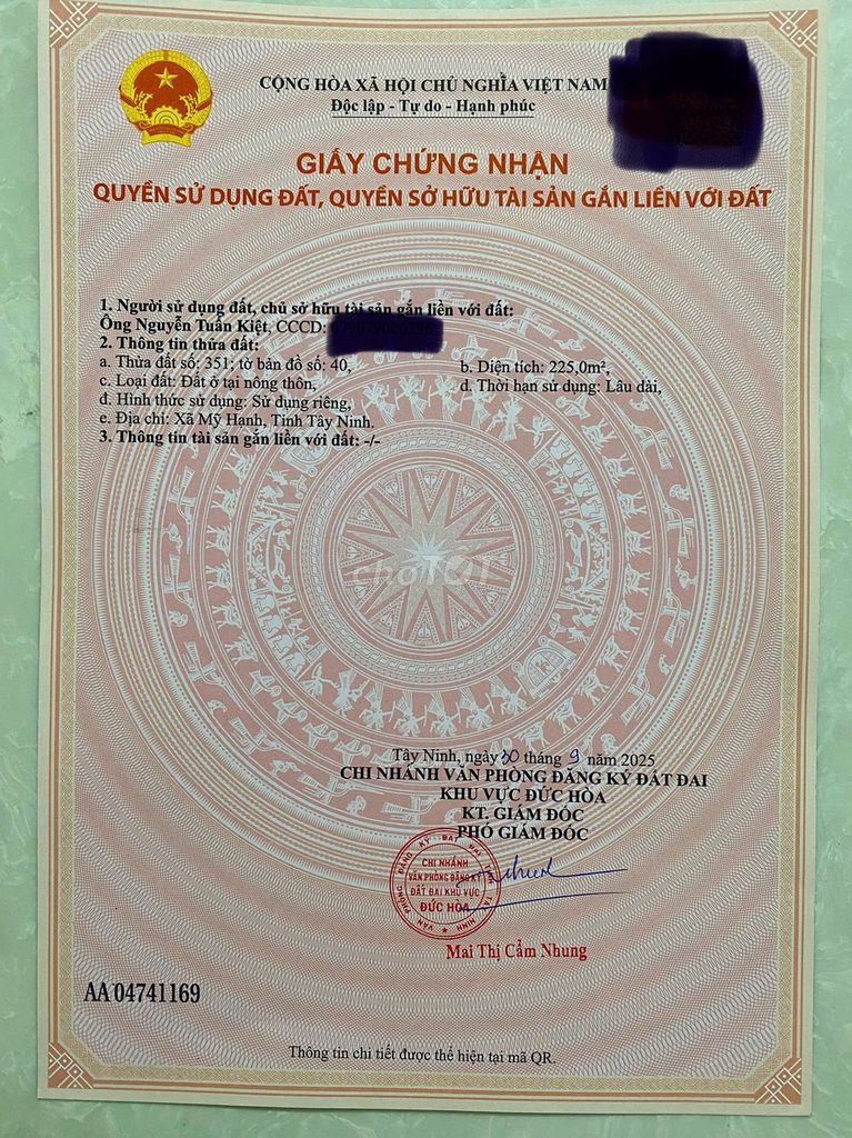Tôi chủ cần bán lô đất 10mx45m=449m² thổ cư 100% đối diện TTHC công xã Mỹ Hạnh mới, vị trí trung tâm ngay phía sau UBND xã, bán kính 200m có đủ tiện ích TT y tế xã - chợ MHNam - trường tiểu học Nguyễn Thị Hạnh - TGDĐ - BHXanh ... Cách ngã tư ĐT824-Gò Hưu-Giồng Lớn chỉ 200m. Cách ranh Hóc Môn VĐ3 TPHCM chỉ 4km. Khu dân cư đông nghẹt cực sung. Tôi đã tách ra 2 thửa có 2 SH riêng. Hẻm bê tông rộng 5m xe tải 5T vào tận đất tiện xây nhà trọ,kho xưởng hoặc xây 10 căn bán vi bằng lợi nhuận cao (có hợp tác đầu tư xây bán). Khuyết điểm *** là gần mấy cái mộ lâu đời của chủ đất kế bên. Giá chốt bán trong tháng 12 là 3,68 tỷ bao tất cả thuế phí sang tên . Mong tiếp khách thiện chí. Xin miễn môi giới và đăng tin QC.