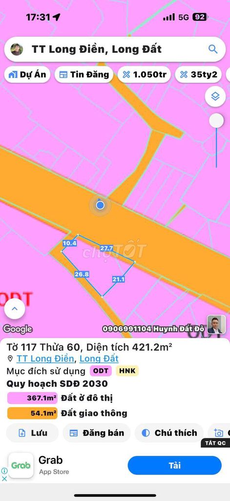 Với diện tích đất 80m² (5x15m), đất thổ cư, mặt tiền đường nhựa 10m rộng rãi, có vỉa hè 6m, gần chợ (cách 800m), giá chào bán 1,7 tỷ đồng tương đương 21,25 triệu đồng/m². Đây là mức giá khá cao so với mặt bằng chung đất thổ cư tại huyện Long Điền hiện nay.