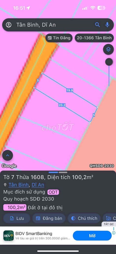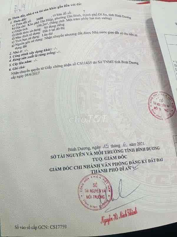 Đây là lô đất thổ cư diện tích 100,2m², ngang 5m dài 20m, tọa lạc tại phường Tân Bình, TP. Dĩ An, Bình Dương, gần đường Nguyễn Thị Tươi và các tiện ích như chợ Phú An, vòng xoay An Phú. Giá chào bán 2,65 tỷ đồng tương đương khoảng 26,45 triệu/m².