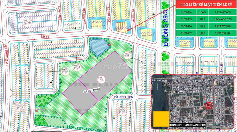 | Cồn Dầu, gần đó (4 lô liền kề) | 104.5 – 128.2 | 6,9 – 7,7 | 52.3 – 60 | Giá gốc CĐT Sun Group, mặt tiền 20m, tổng 464.3 m² |