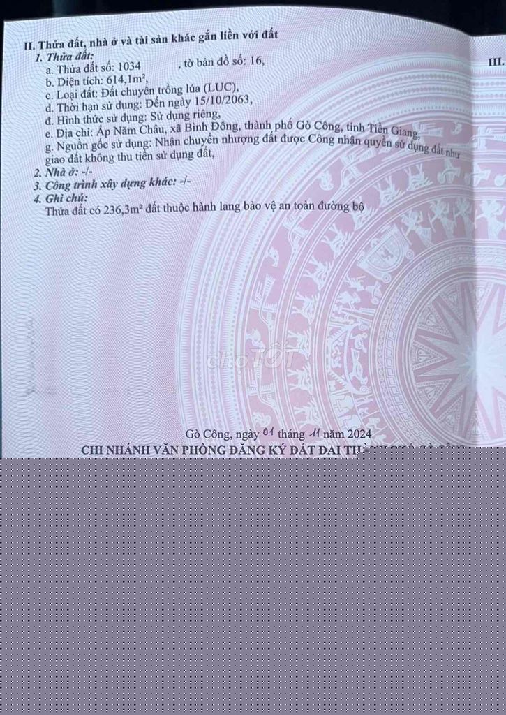 | Gò Công Đông, Tiền Giang | Đất thổ cư | 500 | 3,0 | 1,5 | Gần đường chính, tiện ích đầy đủ | 2024 |