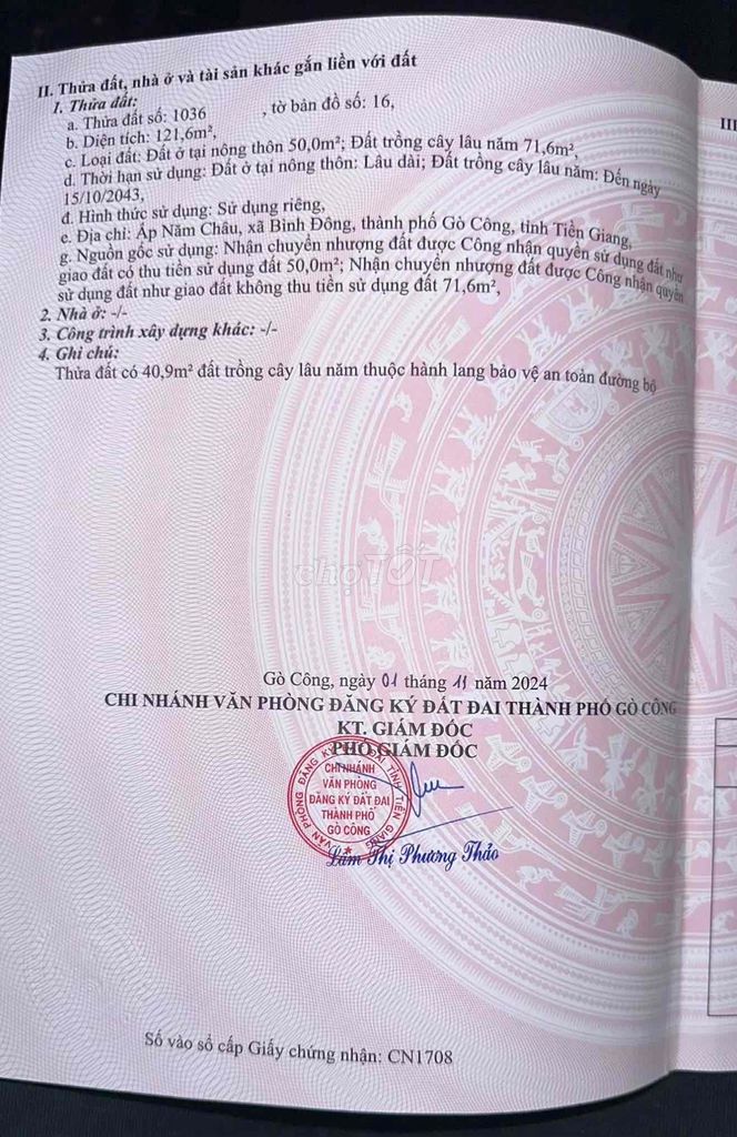 | Thị xã Gò Công, Tiền Giang | Đất vườn có thổ cư | 1000 | 2,2 | 2,2 | Cách mặt tiền 200m, hẻm xe máy | 2024 |