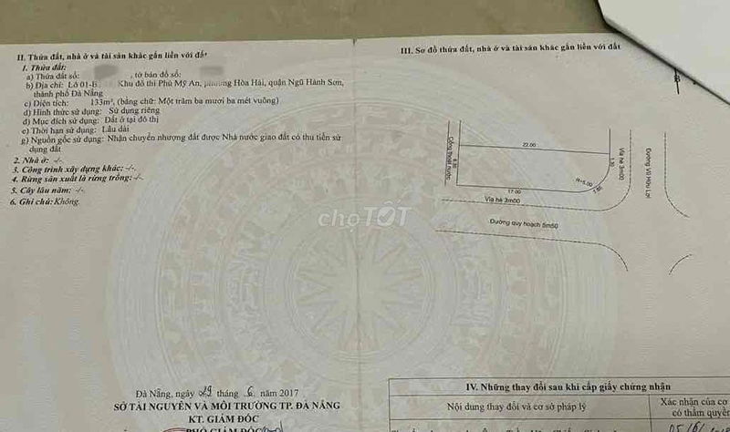 | Hòa Hải, Q. Ngũ Hành Sơn | Đất thổ cư, mặt tiền | 133 | 52,63 | 7,0 | Giá chào bán hiện tại |
