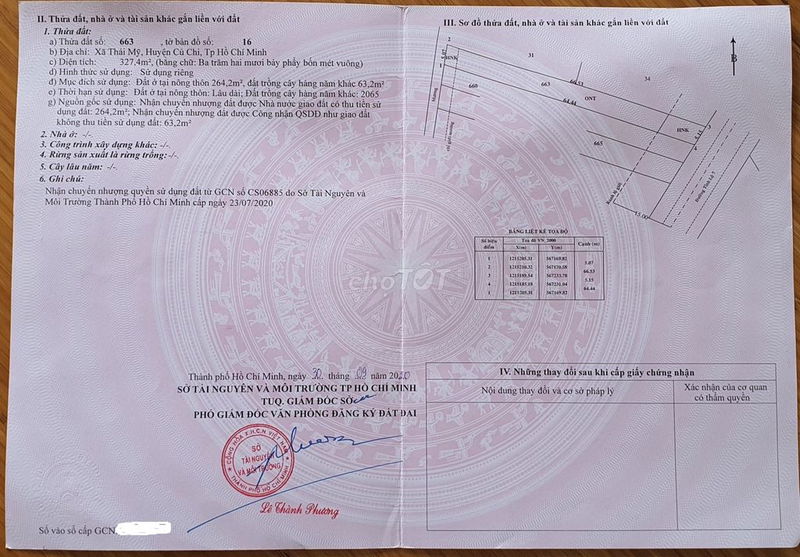 | Đường TL7, Xã Thái Mỹ, Củ Chi | 327 | 10,7 | 3,5 | Đất thổ cư mặt tiền, sổ hồng, gần sân Golf West Lake | 2024 |