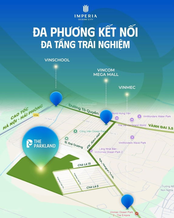 – The Parkland là phân khu thuộc đại đô thị Ocean Park 2-3 có quy mô lớn với nhiều tiện ích nội khu và ngoại khu đa dạng, bao gồm công viên rộng 3,6ha, hầm để xe, và các tiện ích dịch vụ như Vincom, Vinschool, bệnh viện Vinmec 6*, biển hồ tạo sóng, công viên nước…