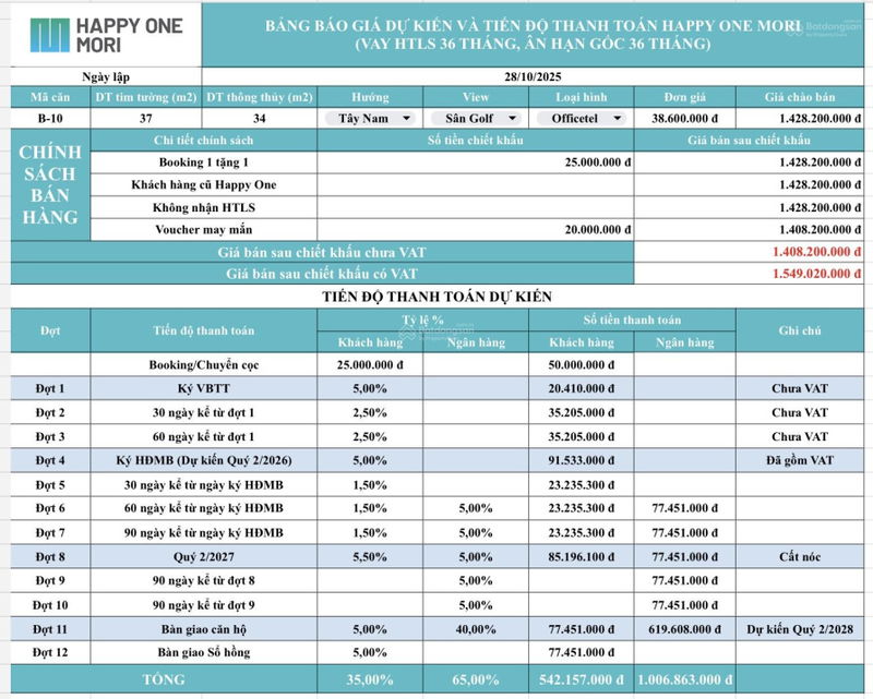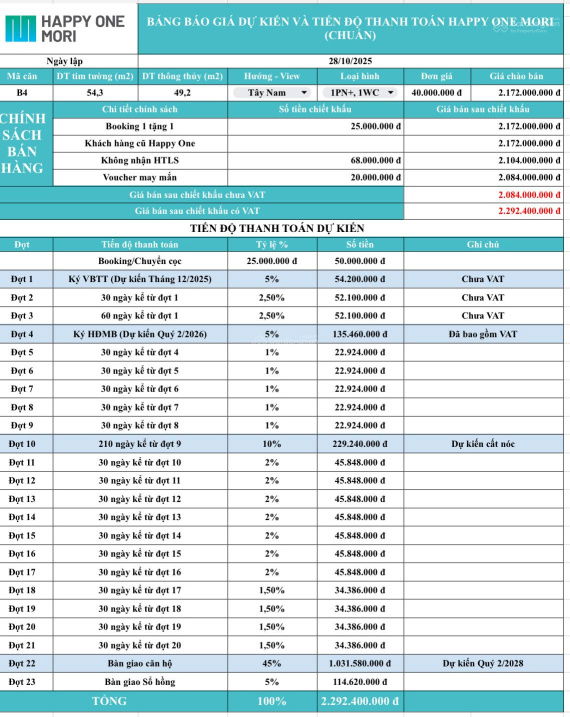 | Happy One Mori (căn hộ 2PN) | 2PN | 55 | 2,0 | 36,36 | Pháp lý sổ hồng, thanh toán linh hoạt |