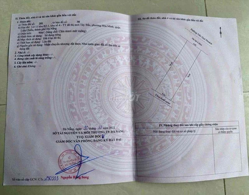 Lô đất có diện tích 90 m² với mặt tiền 5m, chiều dài 18m, hướng Đông Bắc, thuộc loại đất thổ cư với sổ đỏ đầy đủ, tọa lạc tại vị trí cách Hồ Tùng Mậu chỉ 50m và gần biển Hòa Minh – khu vực có nhiều tiện ích như siêu thị, trường học, khu trung tâm phát triển. Mức giá 5,95 tỷ tương ứng giá khoảng 66,11 triệu đồng/m².