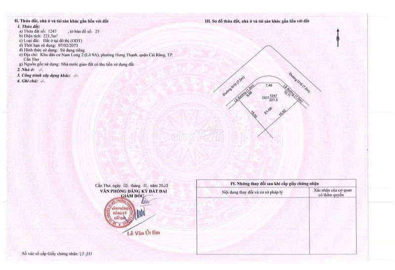 Với diện tích 221 m², chiều ngang 15 m và chiều dài 16,5 m, vị trí đất tại đường Quốc lộ 1, phường Hưng Thạnh, quận Cái Răng là vùng có tiềm năng phát triển và giao thông thuận tiện. Giá bán được chào 9 tỷ tương ứng khoảng 40,72 triệu đồng/m², thuộc loại đất thổ cư, có sổ hồng pháp lý rõ ràng và là đất mặt tiền hai mặt tiền hướng Đông Bắc và Tây Bắc.