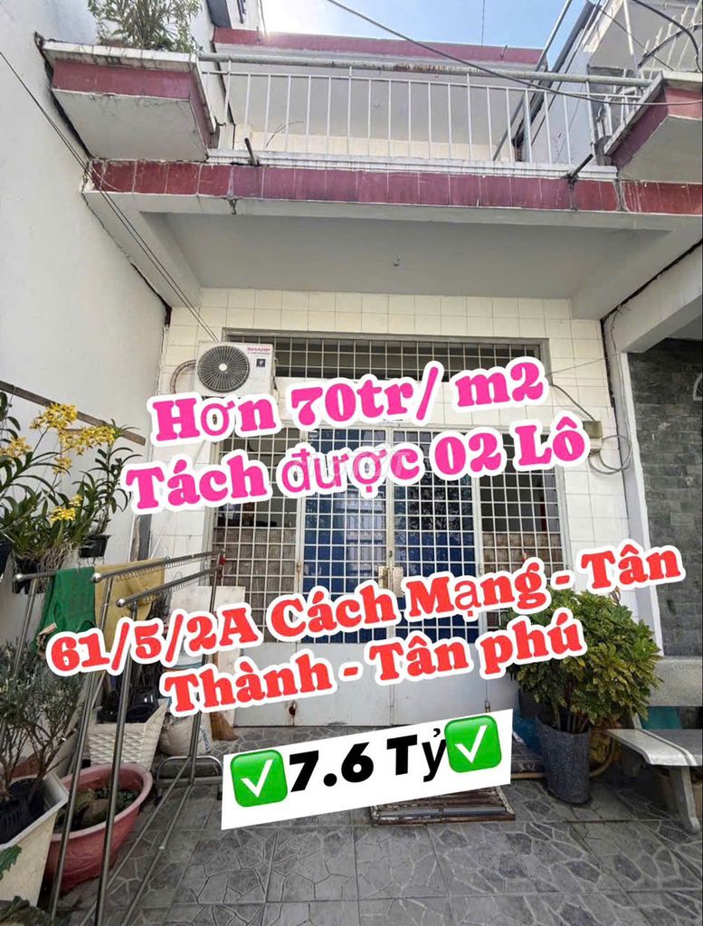 Nhà có diện tích đất 98 m², diện tích sử dụng 160 m², xây 2 tầng (trệt + 1 lầu) với 6 phòng ngủ, 6 phòng vệ sinh. Giá chào bán là 7,6 tỷ đồng, tương đương khoảng 77,55 triệu/m² đất hoặc khoảng 47,5 triệu/m² diện tích sử dụng. Với mức giá này, nếu so sánh với mặt bằng khu vực Tân Phú, đặc biệt khu vực Phường Tân Thành gần đường Cách Mạng, mức giá này có phần cao so với nhà trong hẻm xe hơi cùng diện tích.
