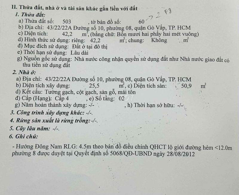 | Vị trí | Hẻm 225 Nguyễn Văn Khối, Phường 8, Gò Vấp | Hẻm nhỏ, gần trung tâm Gò Vấp, các tiện ích đầy đủ |