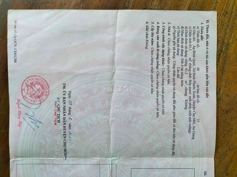 Nhà diện tích đất 41m², diện tích sử dụng 70m², giá bán 330 triệu đồng tương đương khoảng 8,05 triệu đồng/m² diện tích sử dụng. Đây là nhà nát, nằm trong hẻm nhỏ tại xã Bình Phước Xuân, huyện Chợ Mới, An Giang – một khu vực nông thôn với mức giá đất nền và nhà ở thường dao động thấp hơn nhiều so với thành phố lớn.