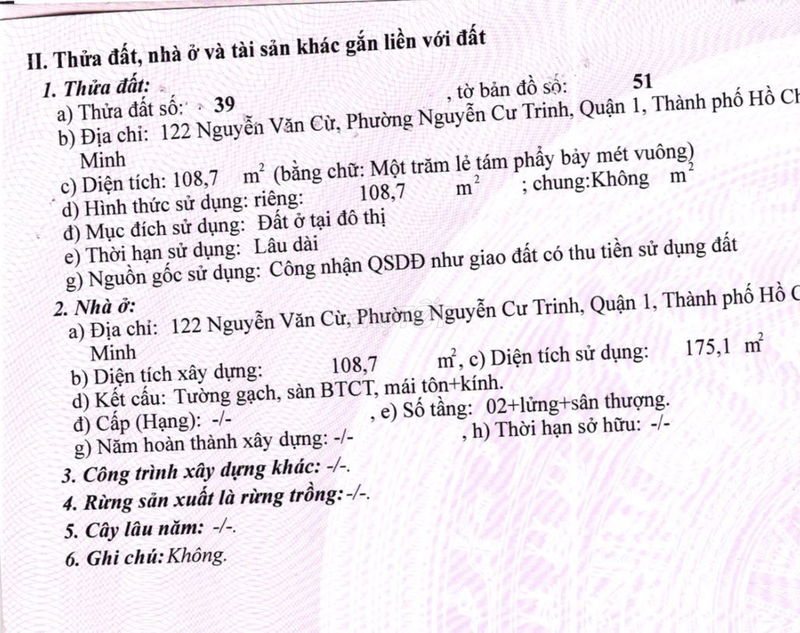 | Vị trí | Quận 1, đường Nguyễn Văn Cừ | Trung tâm TP, gần các tiện ích và tuyến giao thông chính | Vị trí đắc địa, dễ dàng khai thác kinh doanh hoặc cho thuê cao cấp |