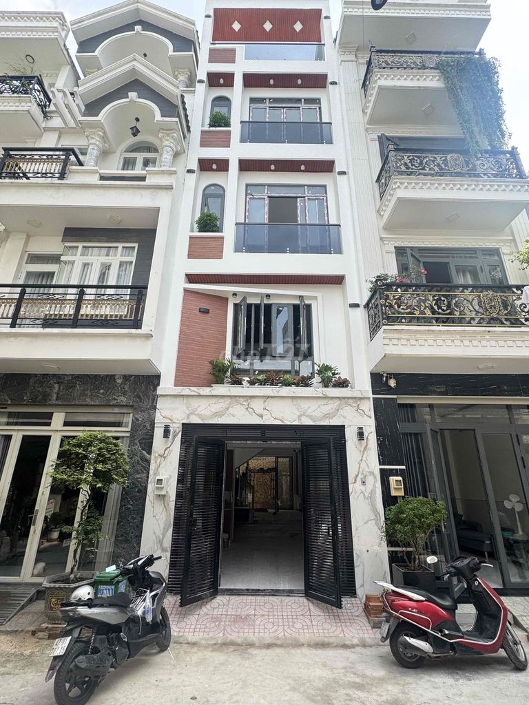 Căn nhà có diện tích đất 52m² (4m x 13m), tổng diện tích sử dụng khoảng 180m² với kết cấu 1 trệt, 1 lửng, 2 lầu và sân thượng, gồm 5 phòng ngủ và 5 phòng vệ sinh. Giá chào bán 5,7 tỷ tương ứng với đơn giá ~109,62 triệu/m² diện tích sử dụng.