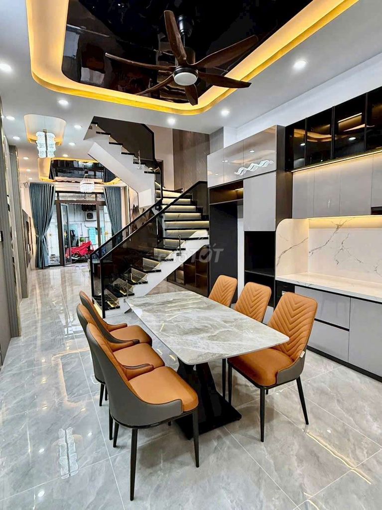 Nhà phố 3 lầu, diện tích 5x12m, tọa lạc tại Đường Huỳnh Tấn Phát, Thị trấn Nhà Bè với giá bán 5,55 tỷ đồng tương đương khoảng 92,5 triệu đồng/m², đã có sổ hồng riêng và nội thất cao cấp đầy đủ là mức giá khá cao so với mặt bằng chung khu vực Nhà Bè hiện nay.