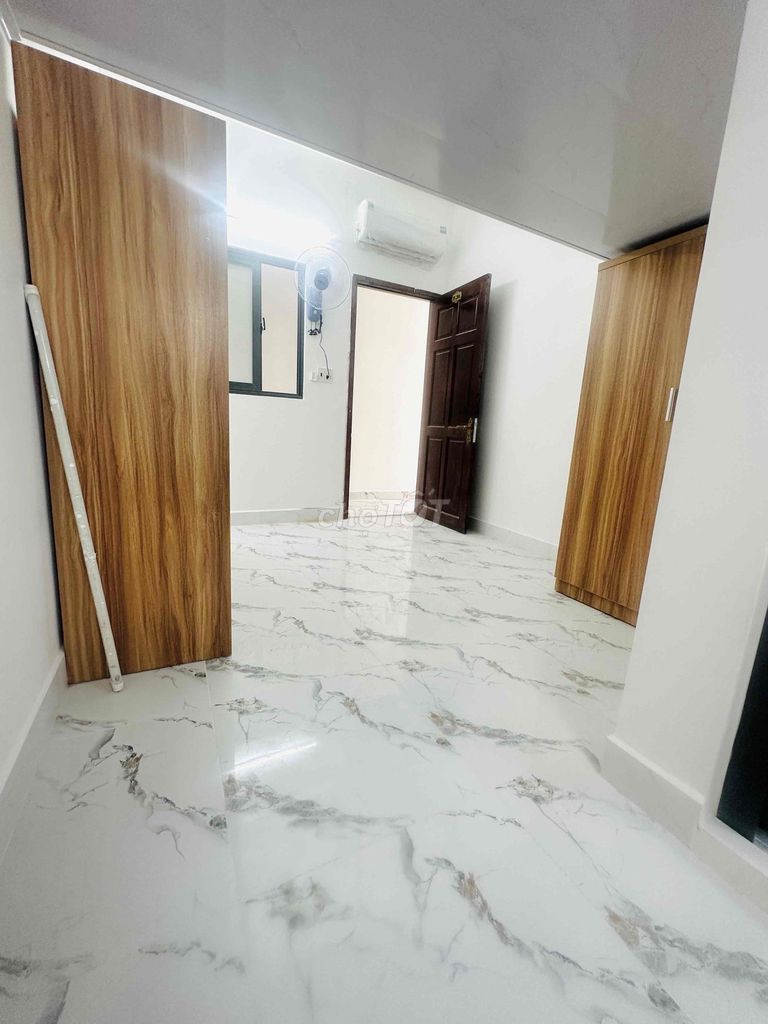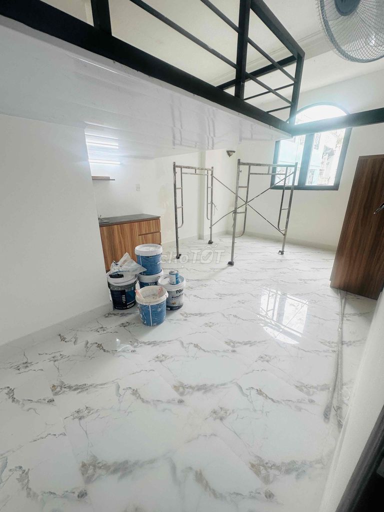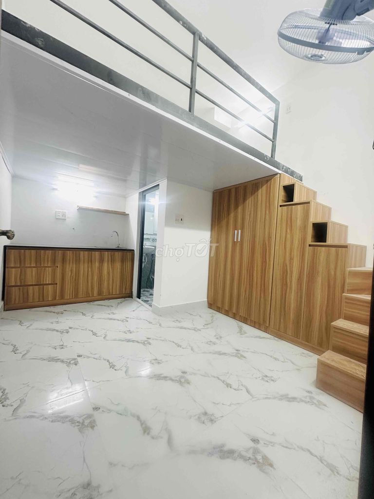 Phòng trọ được mô tả là studio hoặc duplex với diện tích khoảng 30 m², nội thất cao cấp bao gồm máy lạnh, quạt, tủ quần áo, tủ bếp, thang máy trong tòa nhà, khu vực an ninh, gần chợ Phạm Văn Hai. Giá thuê đề xuất là 4 triệu đồng/tháng.