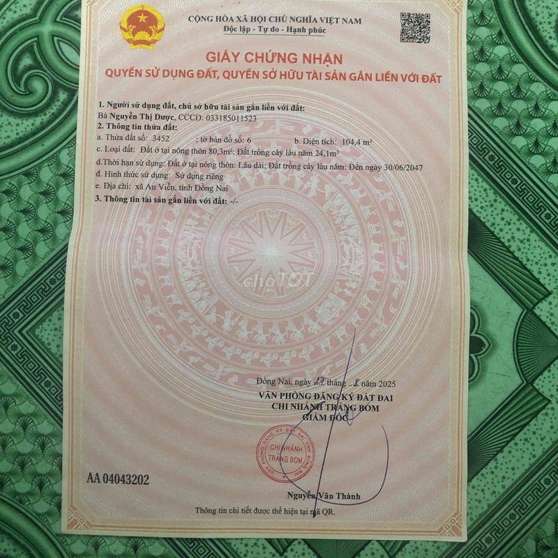 Giá 3,7 tỷ đồng cho lô đất diện tích 104,4 m² tại Thị trấn Trảng Bom, Đồng Nai tương đương khoảng 35,44 triệu đồng/m² là mức giá khá cao so với mặt bằng chung đất nền dự án tại khu vực này. Với vị trí mặt tiền đường rộng 32 m, hướng Đông Nam, gần công viên, trường đại học mới, khu công nghiệp và sân bay cách 4 km, đây là những yếu tố thuận lợi nâng giá trị bất động sản.