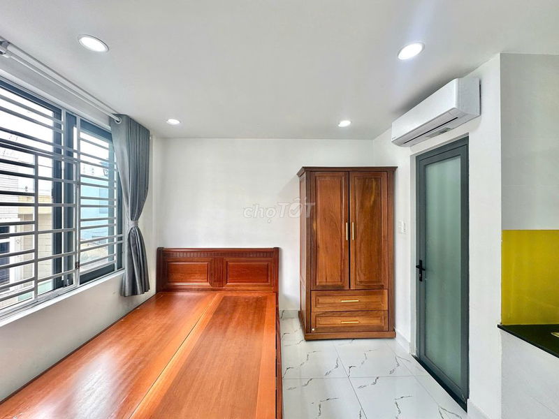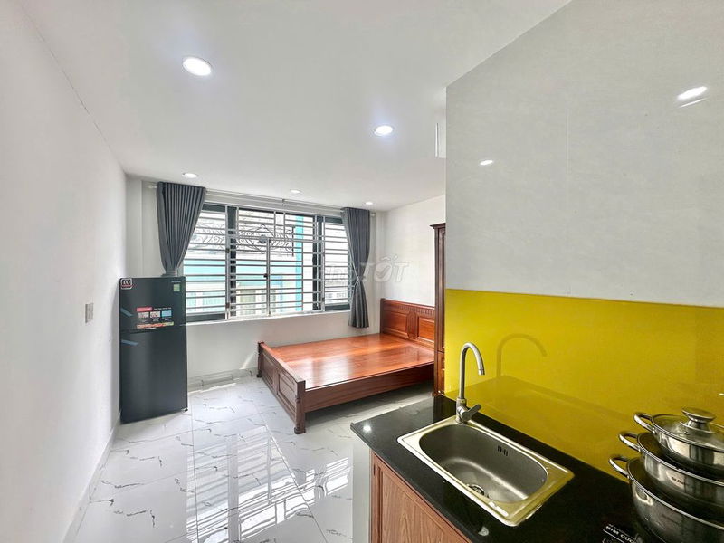 - Diện tích 28 m² với nội thất cao cấp: Giường nệm, tủ áo, điều hòa, tủ lạnh, kệ bếp, nhà vệ sinh riêng, máy giặt, sân phơi và hệ thống an ninh vân tay. Đây là các tiện ích vượt trội so với phòng trọ thông thường chỉ trang bị nội thất cơ bản.