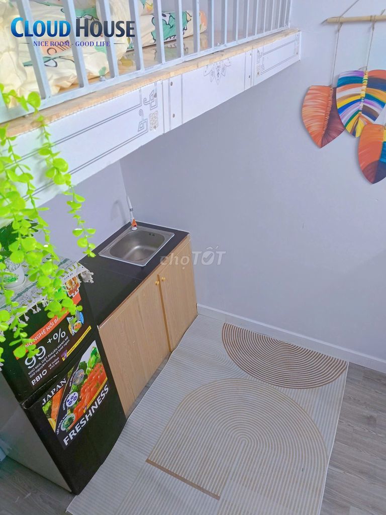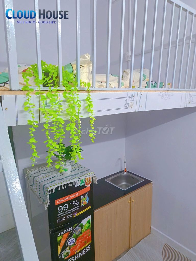 Phòng có gác cao, không bị đụng đầu, đây là điểm cộng so với các phòng trọ thông thường có gác thấp gây cảm giác chật chội. Nội thất đầy đủ và khóa vân tay cũng nâng cao an ninh, tạo sự tiện nghi cho người thuê.
