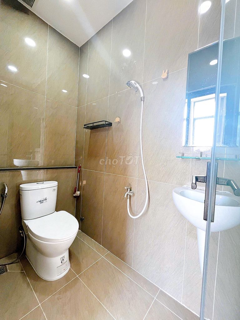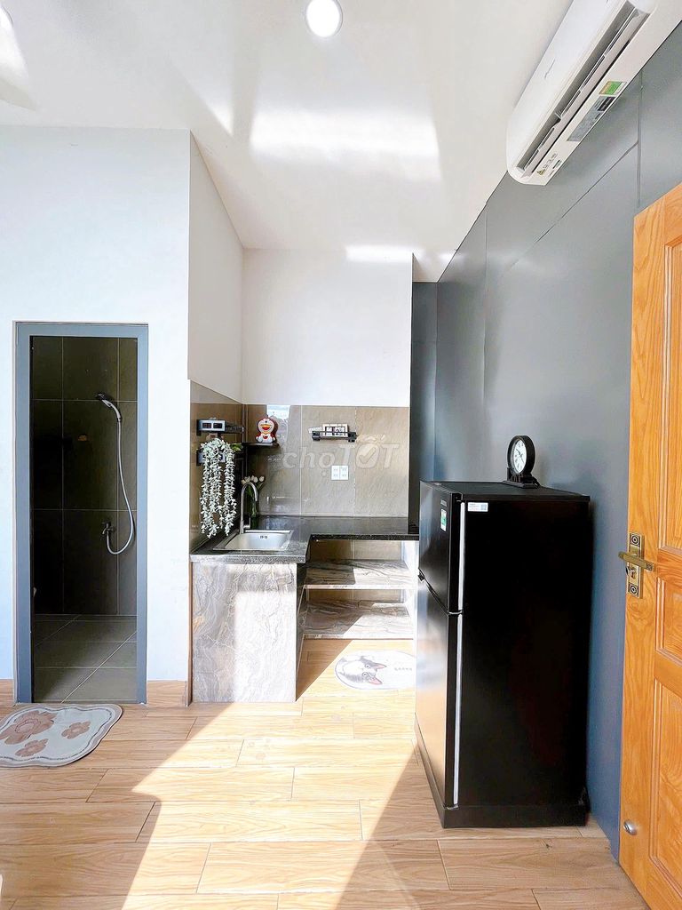 - 20m2, nội thất: Giường nệm sạch sẽ, kệ bếp, máy lạnh, bồn rửa chén, ban công, tủ quần áo, toilet riêng, bàn ghế, thang máy, nội thất như mới
