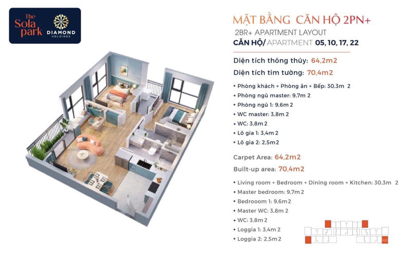 - Diện tích từ 32m², 43m², 55m², 62m², 64m², 76m²...