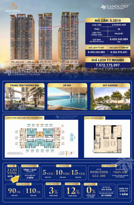 Căn hộ 3 phòng ngủ, diện tích 95 m² tại dự án Newtown Diamond, quận Ngũ Hành Sơn, Đà Nẵng đang được rao bán với mức giá khoảng 7,5 tỷ đồng. Đây là một mức giá khá cao so với mặt bằng chung các căn hộ cùng loại hình và vị trí ở khu vực này hiện nay. Tuy nhiên, mức giá này có thể hợp lý trong những trường hợp đặc biệt như căn hộ thuộc tầng cao, view đẹp, thiết kế nội thất cao cấp hoặc có các chính sách ưu đãi đi kèm hấp dẫn.