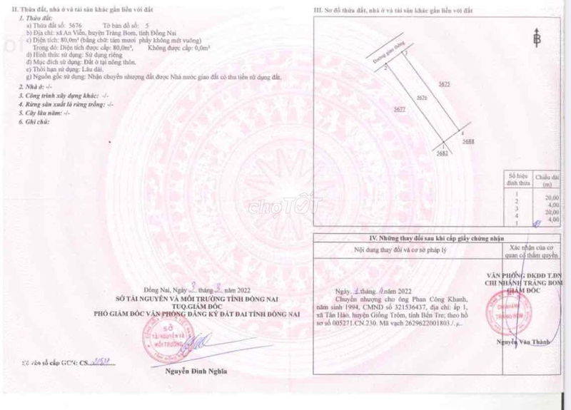 Mức giá 1,68 tỷ đồng tương đương khoảng 21 triệu đồng/m² đang được chào bán cho lô đất thổ cư 80m² mặt tiền 4m, chiều dài 20m tại khu dân cư An Viễn, Huyện Trảng Bom, Đồng Nai.