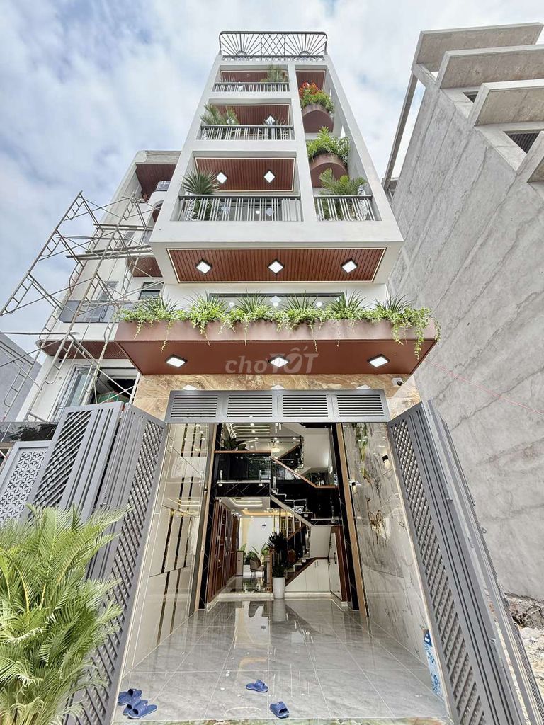 Nhà xây 1 trệt, 1 lửng, 3 tầng lầu, tổng 5 tầng có ô chờ thang máy, nội thất cao cấp, gara ô tô, sân thượng trước sau, 4 phòng ngủ, 6 phòng vệ sinh. Tổng diện tích sàn ước tính khoảng 4,5m x 17m x 4,5 tầng = ~344 m² sàn xây dựng.