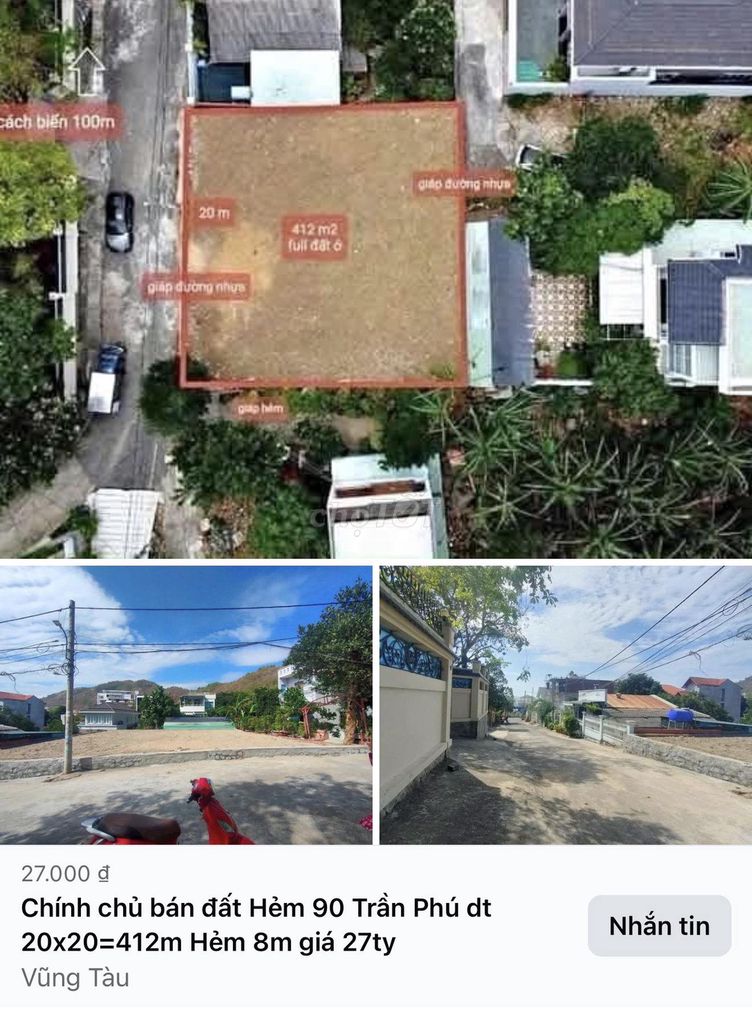 Giá đưa ra hiện tại là 27 tỷ đồng tương đương khoảng 65,53 triệu đồng/m². Đây là mức giá khá cao so với mặt bằng chung đất thổ cư tại khu vực Thành phố Vũng Tàu, đặc biệt là khu vực gần biển Trần Phú.