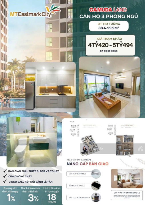 | Nội thất bàn giao | Cơ bản, đã có thiết bị cao cấp (Duravit, An Cường…) | Cơ bản, không có nhiều trang bị cao cấp | MT Eastmark có lợi thế về nội thất hoàn thiện cao cấp. |